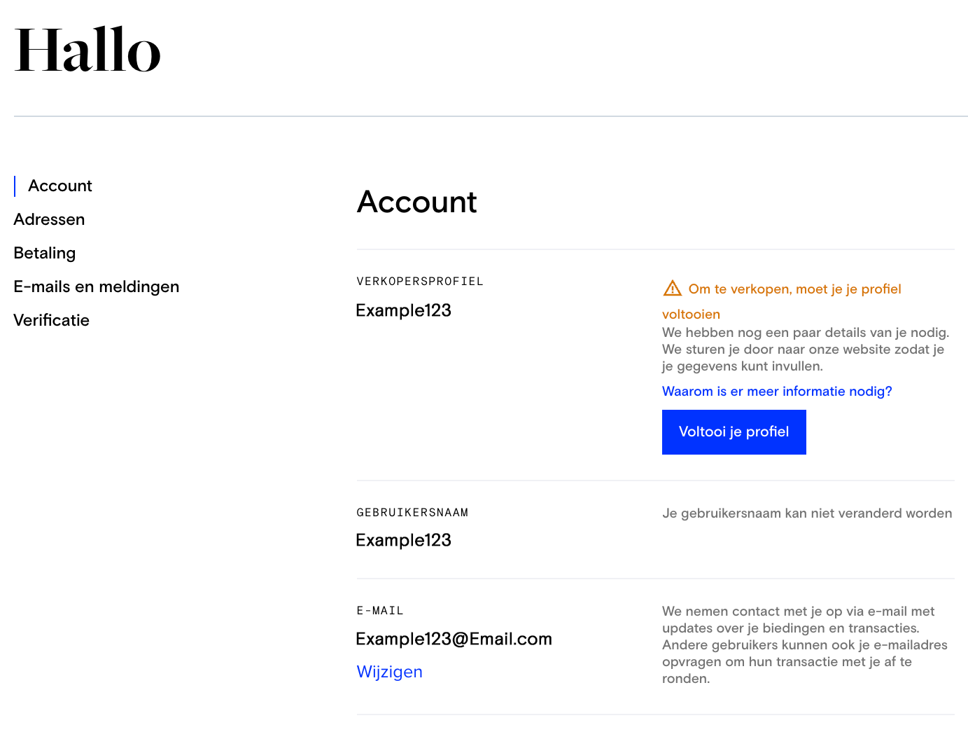 Om je account te kunnen activeren, moeten je gegevens compleet zijn. Als je gegevens niet compleet zijn, kun je niet bieden, kopen of verkopen op Catawiki.
