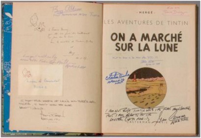 Soms is het niet het verhaal of het verhaal erachter wat een album zo waardevol maakt in online veilingen. Handtekeningen doen het altijd goed, vooral wanneer ze met het verhaal te maken hebben. Zoals met een Franstalig album van Mannen op de Maan dat gesigneerd is door Hergé, Buzz Aldrin, Neil Armstrong en nog meer. Voor dit verhaal, dat 15 jaar voor de eerste bemande maanlanding werd gepubliceerd, deed Hergé zeer uitgebreid onderzoek naar bemande ruimtevaart. Met quotes als "eerste wandelaar op de maan na Kuifje" (Buzz Aldrin) en "langste maanwandeling op die van Kuifje na" (Edgar Mitchell) is het niet zo gek dat het album