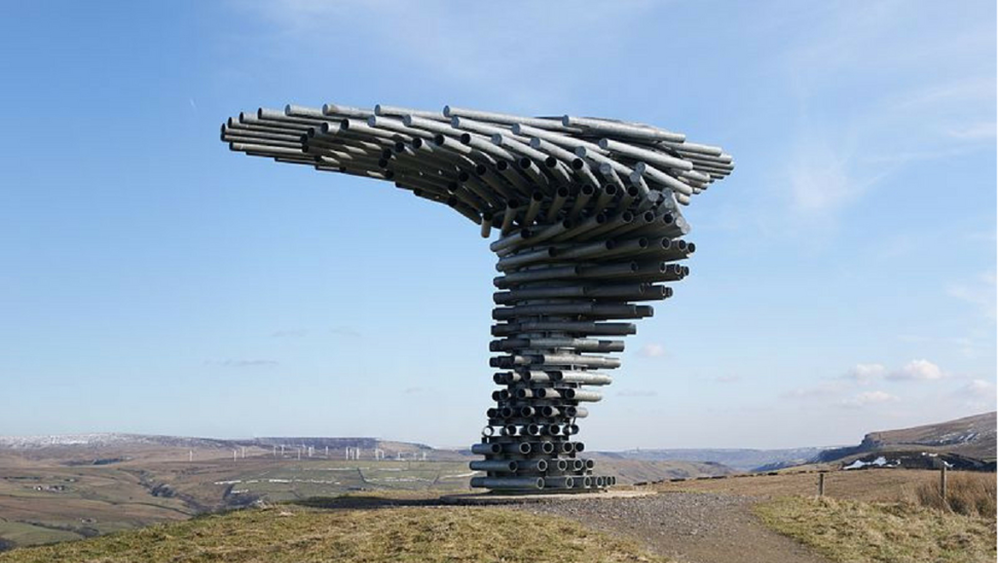 Dit kunstwerk is opgebouwd uit verschillende pijplengtes. Wanneer de wind langs de pijpen blaast, creëert het een angstaanjagend geluid. Het origineel torent 3 meter over het landschap van de East Lancashire in Engeland uit. In maart 2017 is een zuster van de zingende rinkel boom gebouwd buiten Austin, Texas in de Verenigde Staten.