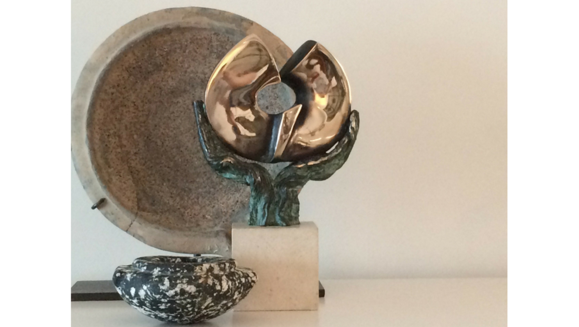Een tijdloos stilleven in een moderne omgeving: Nagada IIzwart met witte pot (Egypte ca. 3500 - 3200 v. Chr.), een Romeinse terracotta vijzel (1e eeuw n. Chr.) en een modern bronzen beeld van Mia Moreaux (°1950)