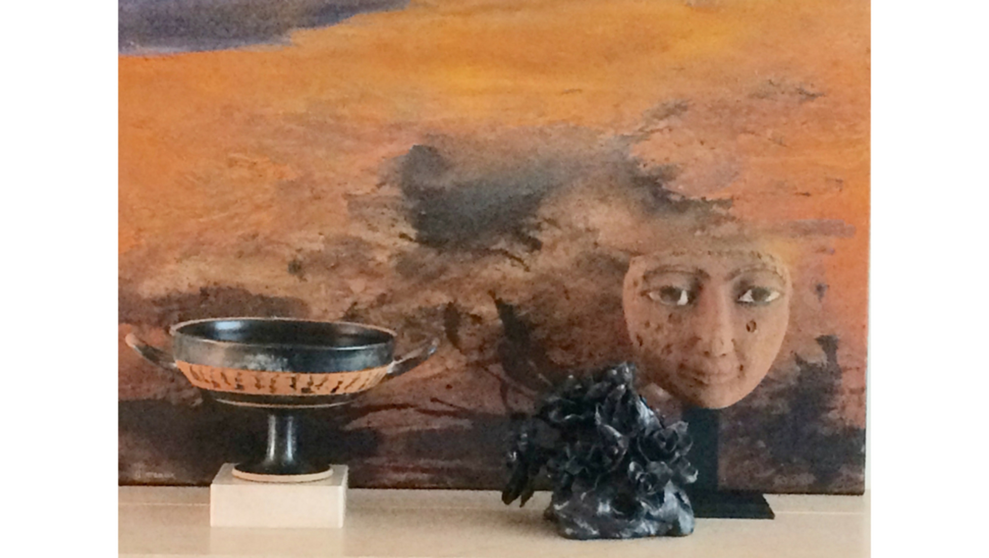 Een compositie van een modern schilderij van de Belgische schilder en beeldhouwer: Mia Moreaux (°1950) met daarvoor: een Egyptisch sarcofaag masker van de 21e dynastie (ca. 1000 v. Chr.) met een betoverende uitstraling en een fijne goedaardige glimlach. Hiervoor een kleine 'Odore di Femmina' in aardewerk van de internationaal befaamde kunstenaar Johan Creten (°1963). Aan de andere kant een Oud-Griekse, zwarte figuur, Attisch kleine meester Kylix van de 6e eeuw v. Chr.