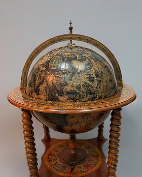 Bar - Tre, Messing, Stoff - Mobil bar i form av en tønne i tre med messingdetaljer, og et par krakker.