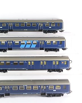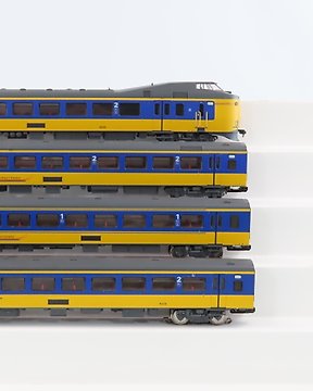 Märklin H0 - Lokomotywa spalinowa (2) - Dwie plastikowe lokomotywy spalinowe, niebieska i żółta. Żółta lokomotywa nosi logo NS. Widoczne - NS, DB