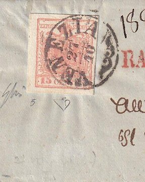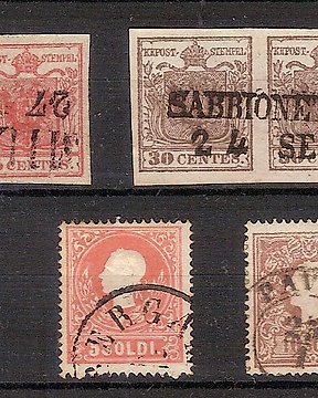 Starożytne państwa włoskie - Królestwo Lombardzko-Weneckie 1850 - I^ seria od 5 c. do 15 c. (filigrana) Sass 1/3 VAR ben marginati używane f.Bolaffi Spl