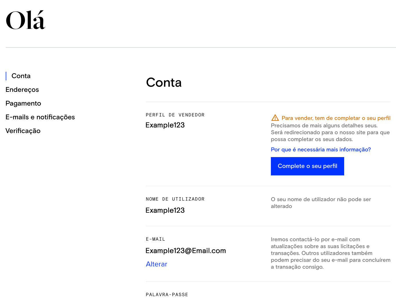 Pode adicionar um endereço de faturação. Se não adicionar um endereço de faturação e for um vendedor profissional a vender como pessoa coletiva, o seu endereço de envio será mostrado publicamente na sua página 'Vendido por', conforme exigido por lei. Quando adiciona um endereço de faturação, este substitui o seu endereço de envio nessas páginas.