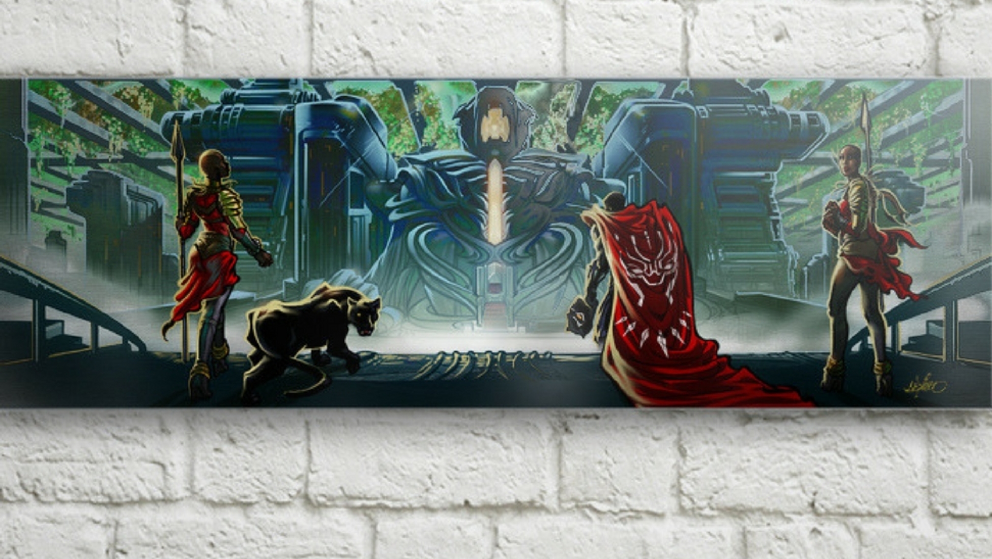 Enquanto artista/ilustrador de livros de banda desenhada e colecionador de livros de banda desenhada da Marvel conhecia bem esta personagem e nunca deixo escapar uma oportunidade de desenvolver uma nova coleção de arte. Na coleção Black Panther decidi criar a peça "Nakia", inspirada na personagem de Lupita Nyong’o como uma mulher que demonstra a sua graça e a sua força. O design "Black Panther Mask" é totalmente original e o meu objetivo era captar o desenvolvimento tecnológico exibido pelo universo Black Panther, com uma mistura de orientação japonesa. Uma das minhas peças favoritas é "Panther Paradise" que acho que apresenta uma imagem do que pode ou não existir em Wakanda. T’challa (Black Panther) está a descer do seu trono numa grande sala cheia de funcionalidades tecnológicas - um bonito mundo.