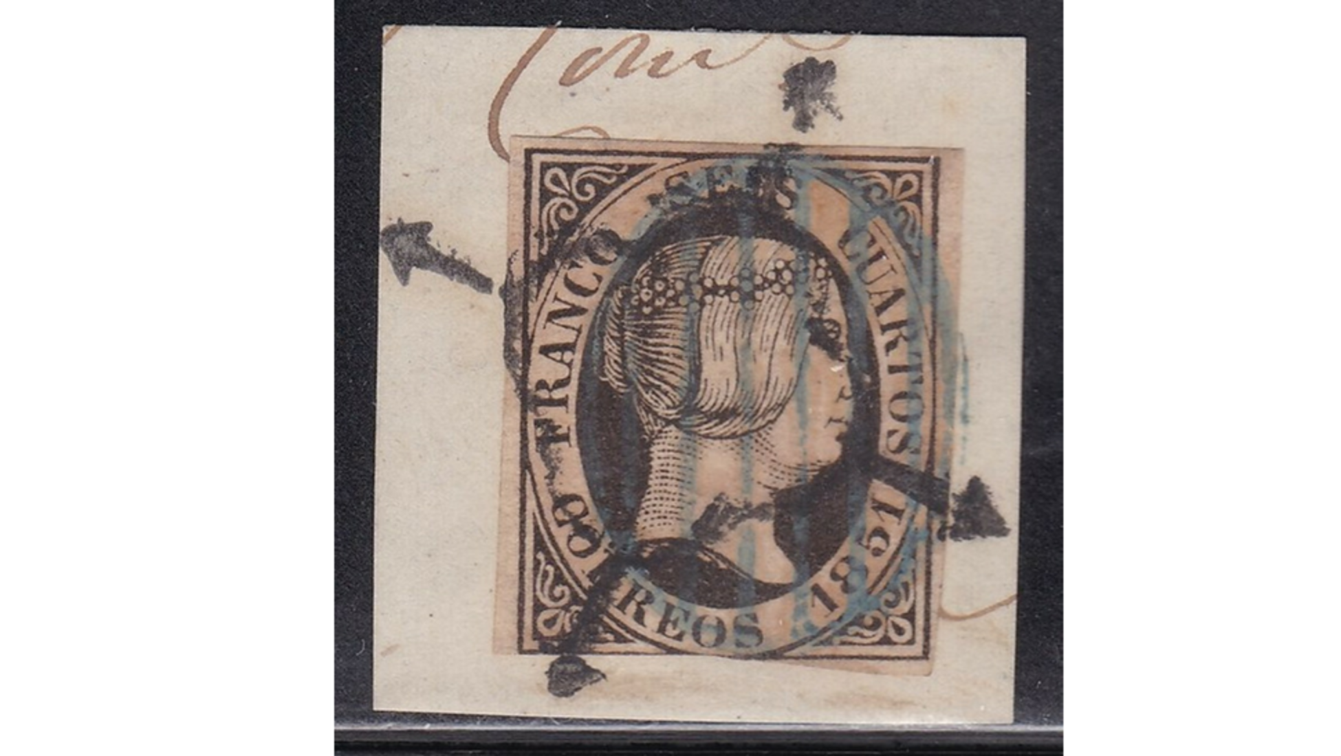 3. Espanha 1851 – Isabel II. Carimbo postal misto com aranha preta e grelha azul