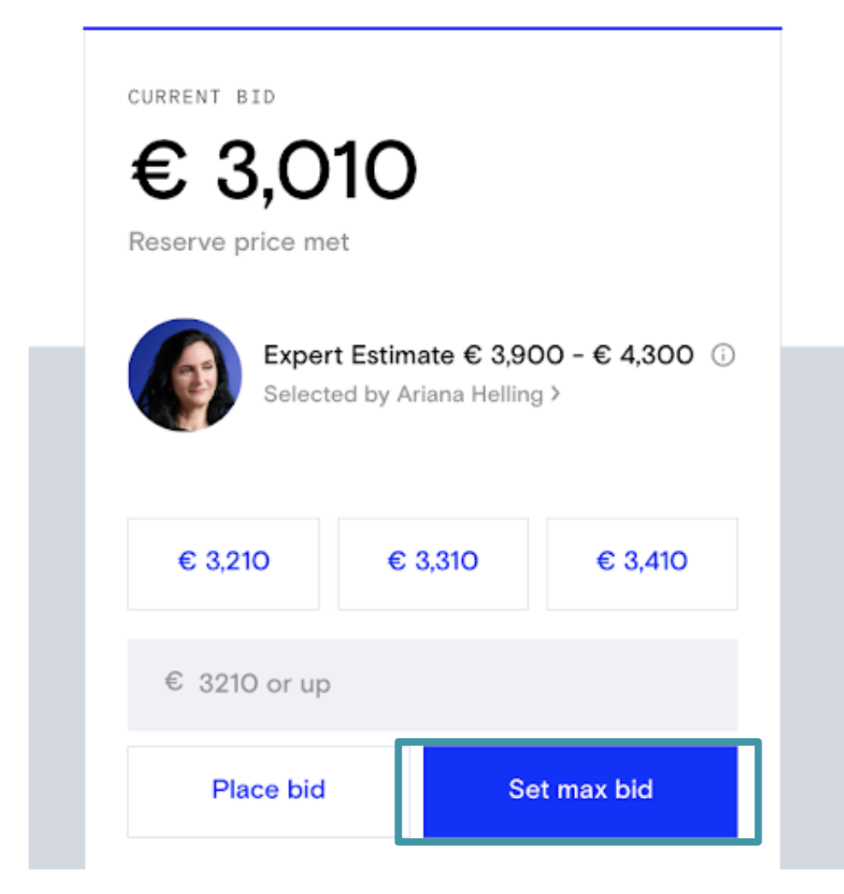 Allt du behöver göra är att bestämma dig för det högsta belopp du är villig att bjuda på ett objekt. Därifrån lägger vi nästa lägsta bud åt dig. Bara klicka eller tryck på knappen "Ange maxbud" för objektet: