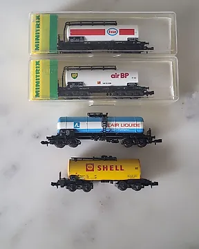 Minitrix, Roco N - 13552 13558 - Modelltåg (4) - Set med fyra tankvagnar i N-skala, märket Minitrix, med tryck för Shell, Air BP, Esso och L'Air - DB Cargo