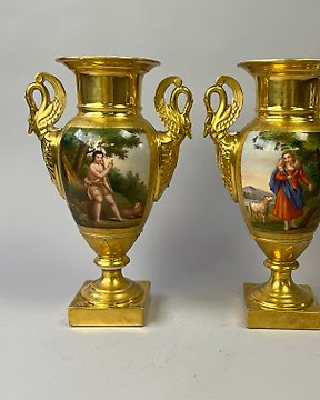 花瓶 (2) - 一对镀金的帝国风格手绘圣经场景花瓶,19世纪上半叶。 - 瓷, 镀金