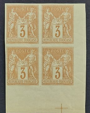 法国 1878 - 贤者,II型,N sous U,3c,赭黄色,不带齿,4块豪华** - Yvert 86a