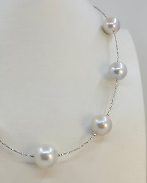 项链 - 18K包金 白金, ALGT 认证圆形白色南海珍珠 - 13.5x15.5毫米