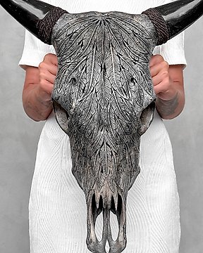 无底价 - C-Authentic 大型灰色水牛头骨 - 人类头骨玫瑰图案 雕刻的颅骨 - Bubalus Bubalis - 68 cm - 66 cm - 18 cm- 非《濒危物种公约》物种 - (1)