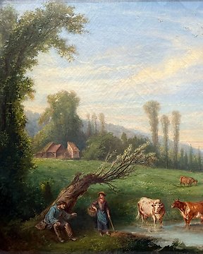 J. C. Courbe (XIX) - Scène Champêtre avec Vaches et une Belle Bergère au bord de l'Eau