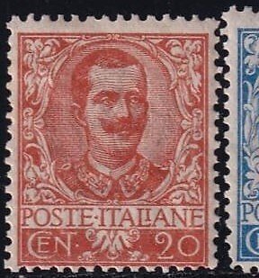 意大利王国 1901 - Floreale 20 号橙色 + 25 号蓝色 Sass 72+73 位置居中,完整无损,MNH** Spl