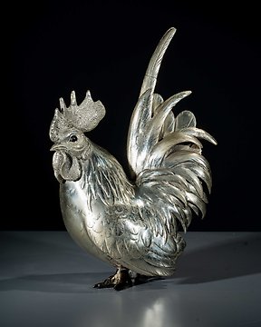 Shibuichi (四分一) - Signed Seizan 晴山 and with mark shirgane 白銀 (white silver) - 一件精细雕刻的shibuichi okimono,描绘一只鸡。 - 大正时期(约1920年)当前出价€5
