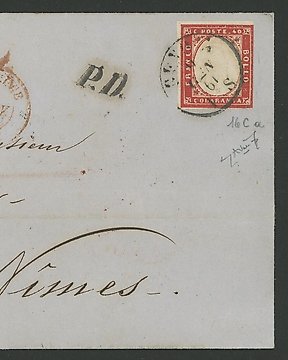 意大利古國-薩丁尼亞 1860 - 1961年1月10日从热那亚寄往尼姆的信,信中提到40分的车票,涉及各种类型的墨水定义。 - Sassone n.16Ca