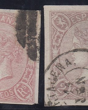 西班牙 1865 - 伊莎贝尔二世。2雷亚尔紫色和三文鱼色。 - Edifil 73 + 73A