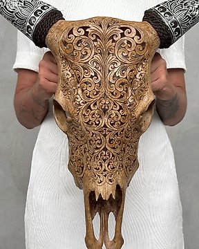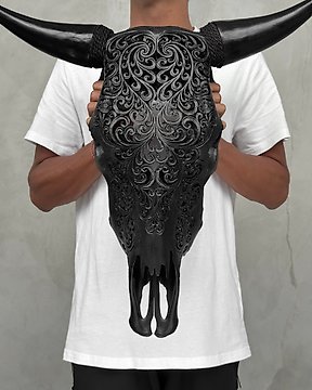 无底价 - 令人惊叹的大型黑色手 - 雕刻牛头骨 - Pakis 图案 雕刻頭骨 - Bos Taurus - 56 cm - 59 cm - 17 cm- 非《瀕臨絕種野生動植物國際貿易公約》物種 - (1)