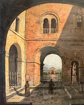 Giovanni Migliara (1785–1837), Attribuito a - Veduta d’interno architettonico con figure monastiche