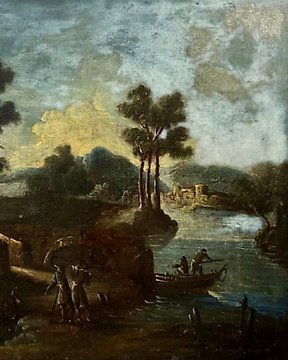 Claude Lorrain (1600-1682), seguace di - Paesaggio lacustre con figure