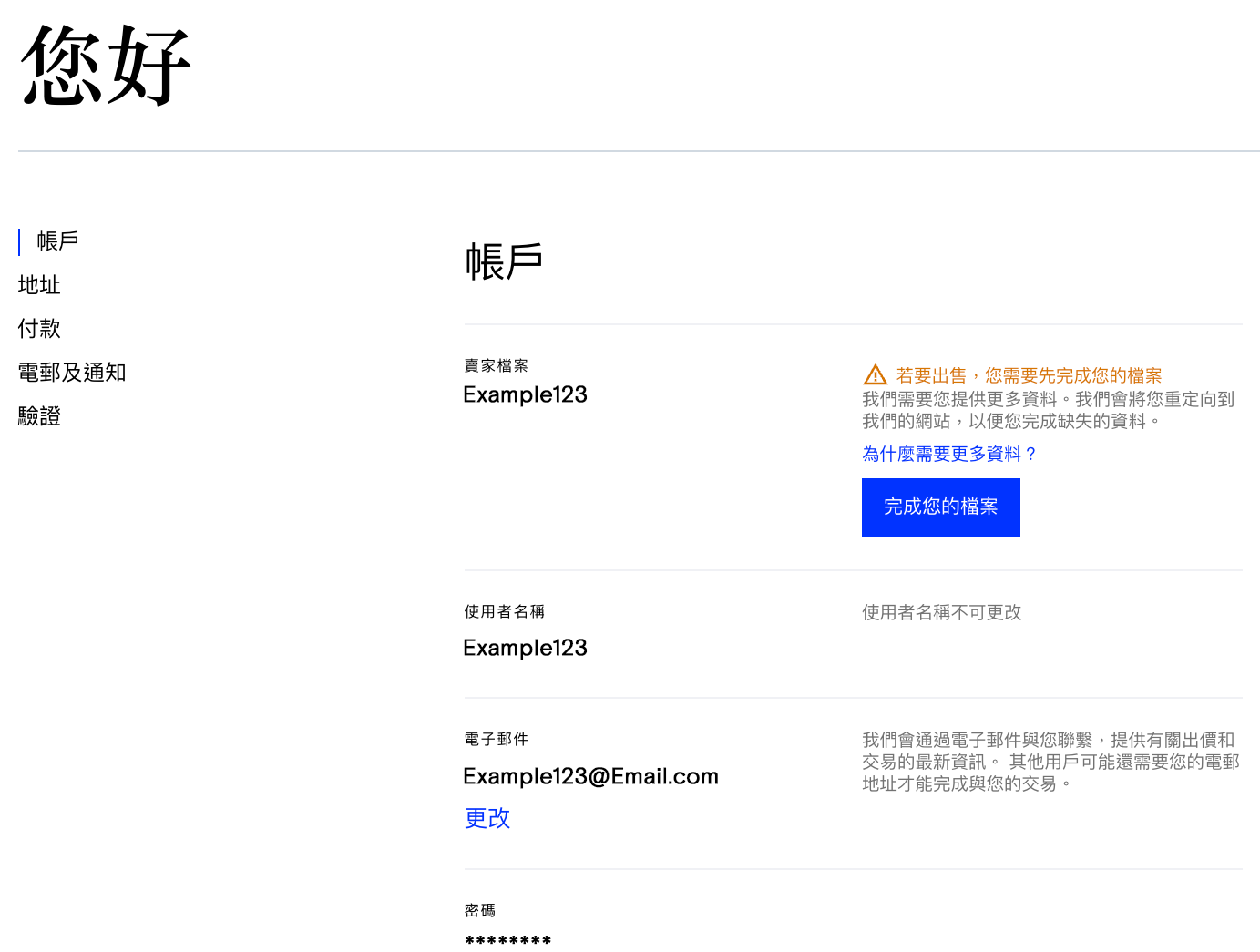 若要調整您的電子郵件地址、密碼或出價貨幣,請選取「變更」。如果您之前沒有出價競拍過,則只能變更出價幣別。