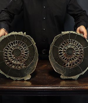 真正独特的化石标本——精彩的黑色硫化辉绿岩菊石对 - 化石碎片 - Speetoniceras sp. - Ulyanovsk, Volga River - Russia - 340 mm - 310 mm開拍價€1